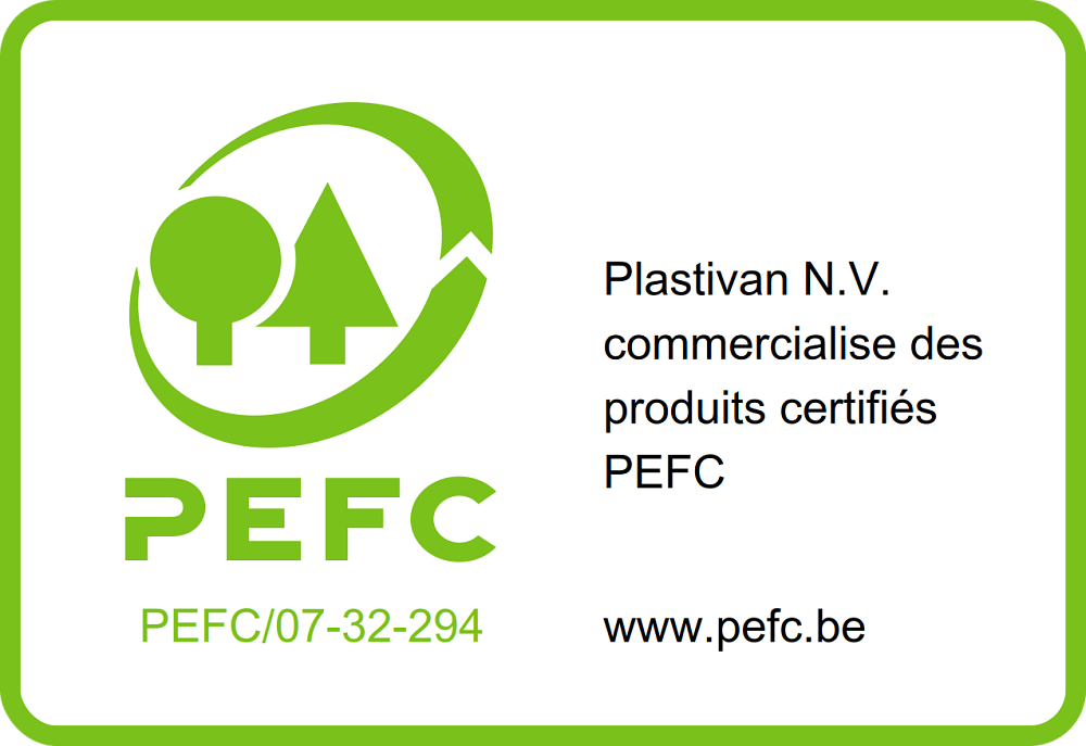 Plastivan possède le numéro de certificat PEFC WOOD.BE-COC-001282 et le numéro de licence PEFC/07-31-294 pour l'utilisation du logo et pour l'étiquetage des produits. L'entreprise suit la norme PEFC ST 2001 pour ses déclarations de certification et pour l'utilisation des étiquettes sur et hors de ses produits. Avec ce document, la direction s'engage à mettre en place la chaîne de contrôle dans l'entreprise et notifier toutes les personnes concernées au sein de l’entreprise.