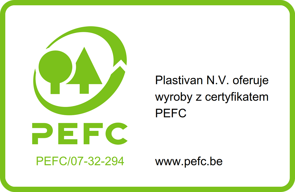 Plastivan posiada certyfikat PEFC nr WOOD.BE-COC-001282 oraz licencję nr PEFC/07-31-294 na używanie logo oraz na znakowanie produktów. Firma stosuje się do standardu PEFC ST 2001 w zakresie deklaracji certyfikacyjnych oraz stosowania etykiet na swoich produktach i poza nimi. Poprzez ten dokument kierownictwo zobowiązuje się do wdrożenia łańcucha dowodowego w firmie i powiadomić wszystkie odpowiednie osoby w organizacji.